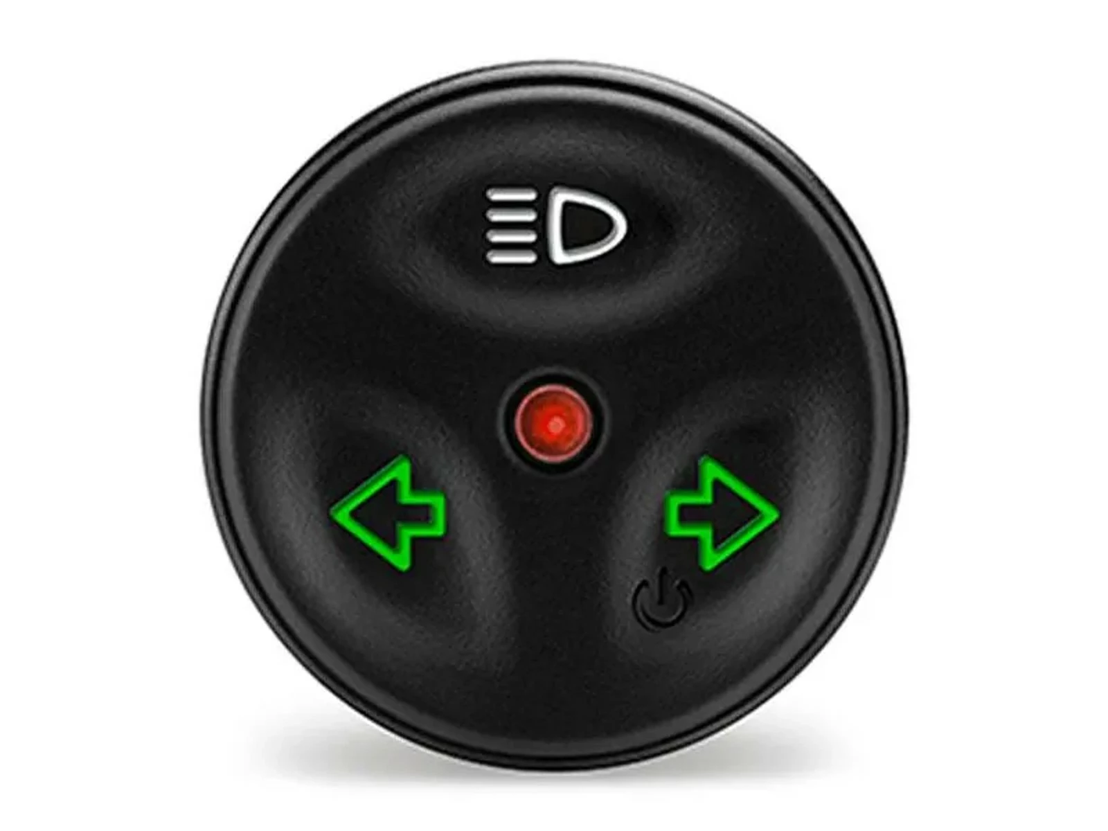 Commandez votre appareil d’aide à la sécurité du cycliste Varia sans quitter le guidon des mains. Cette télécommande à 3 boutons permet de contrôler la luminosité ainsi que la forme, l’intensité et la netteté du faisceau de lumière (haute/basse) et d’allumer les clignotants (nécessite 2 feux arrière). Elle offre également une commande d’allumage/extinction des feux.