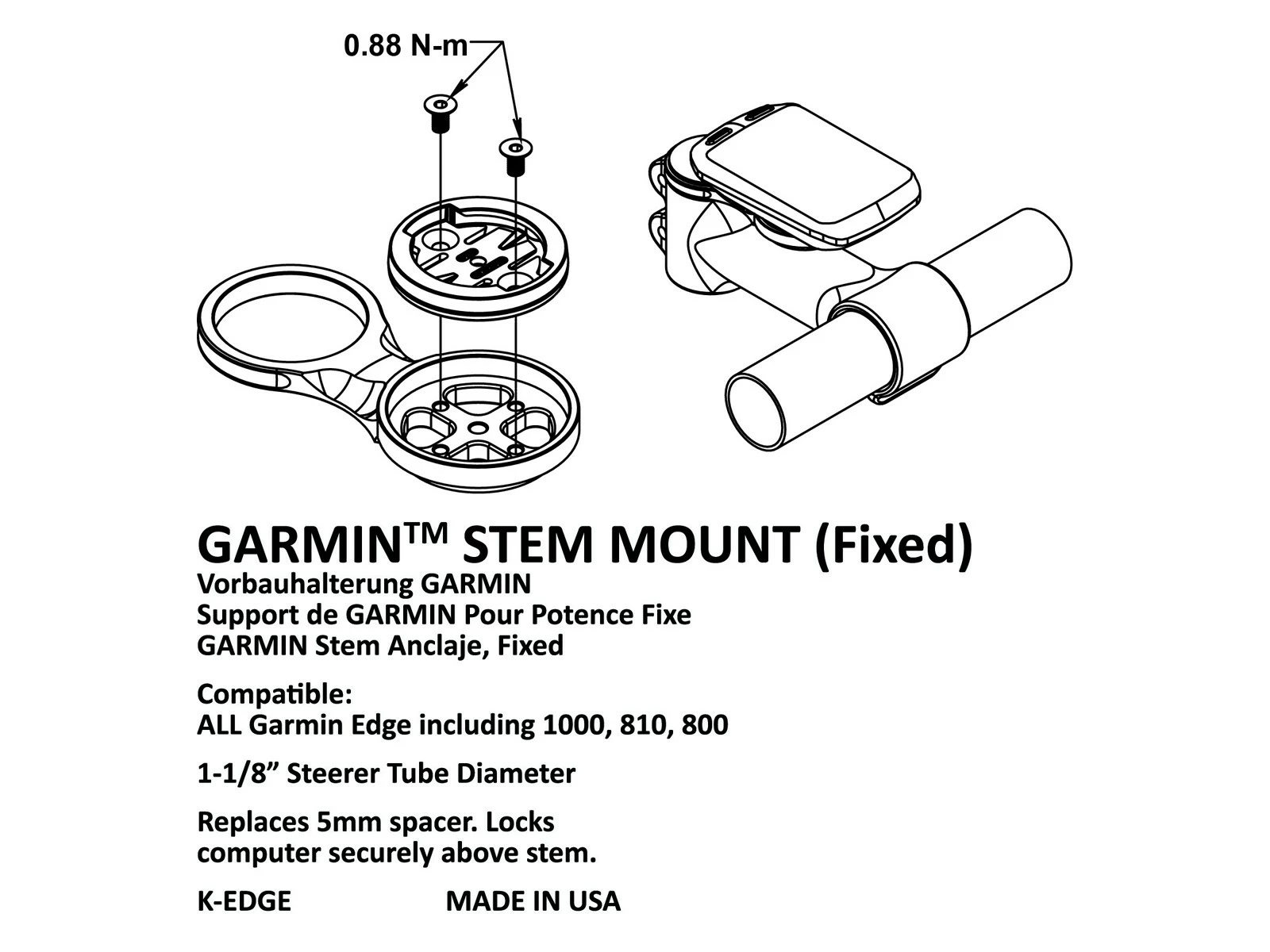 Le support de potence Garmin K-EDGE est une excellente solution de mise à niveau pour les cyclistes qui préfèrent leur ordinateur au-dessus de la potence. Monté sur le tube de direction, le support remplace une entretoise standard de 5 mm et est solidement verrouillé en place par le système de compression du capuchon supérieur.